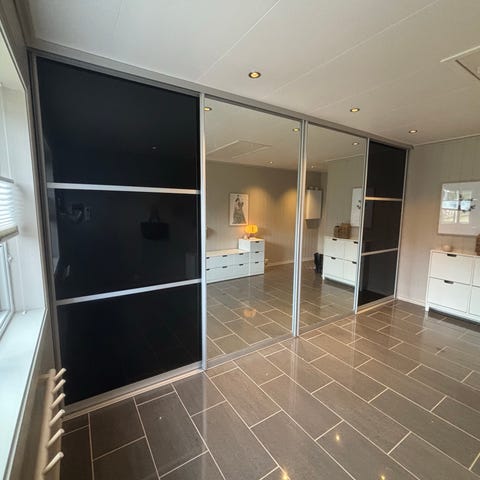 Garderoben monteres inn i en sort ramme med hvite skrog innvendig og fire skyvedører med speil.