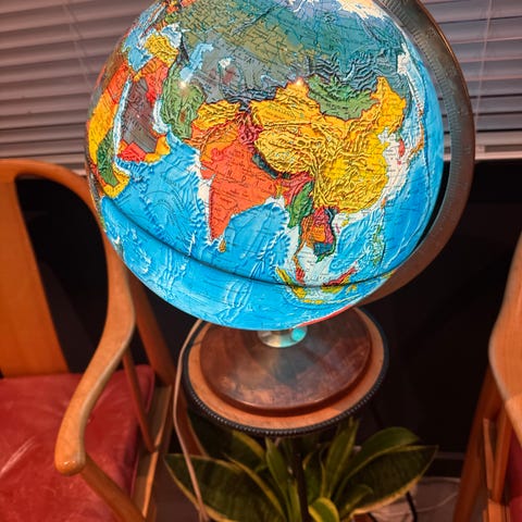 Pent brukt Scan-Globe fra Danmark med innebygd lys. Klassisk utgave med relief/topografi og solid fot i mørkt tre, trolig teak. Har kontakt som passer i standard jordet stikkontakt. Pæren er nylig byttet til en 1.4W LED-pære for lav varme og lang levetid. Grei stand med noen bruksmerker, men ingenting som påvirker funksjon.