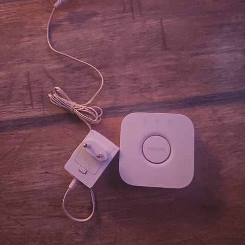 Philips Hue Secure Indoor Kamera i hvit farge. Dette er en innendørs overvåkningskamera med videoopptak og bevegelsesdeteksjon. Kameraet er designet for sikkerhet i hjemmet eller kontoret, og kobles til via Wi-Fi for sanntidsvideo og varsler og via Hue appen.