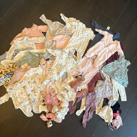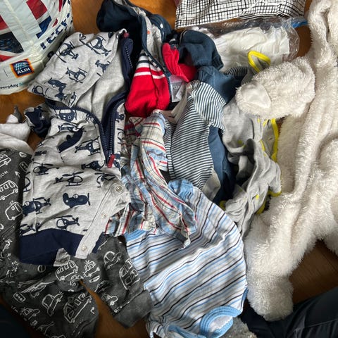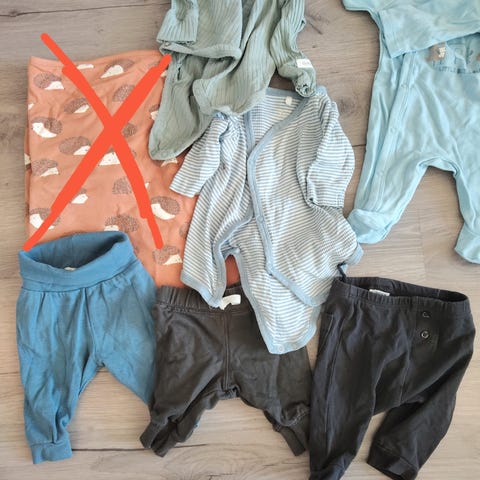 Liten klespakke med 5 kortermede og 4 langermede bodyer med 4 par sokker til baby i størrelser 0-3 måneder. Et par av bodyene ble aldri brukt, mens de andre kun er brukt 1-2 ganger hver.