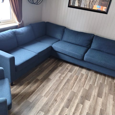 Selger vår flotte Copenhagen 6-seters L-formede hjørnesofa i blå fløyel. Sofaen er i perfekt stand, godt vedlikeholdt og helt ren.
