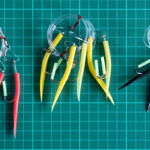 Materialene kan variere litt – avhengig av hva som er tilgjengelige, men basisoppsettet forblir det samme: Et havfisketakkel med tre opphengere med varierende størrelse selvlysende blekksprutskjørt/perler/slange og catfish kroker.