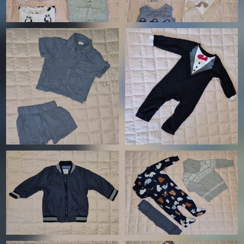Gutt 74 stor pakke. 1 pysj, 2 fin bukser, 1 vest, en pen body, 3 genser, 5 bukser, 4 bodyer, 1 sett med addisas bukse og genser, 2 hjemmestrikk der en er body og den andre jakke