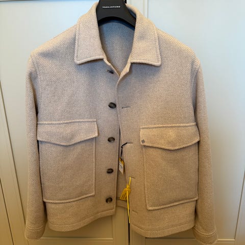 Meget eksklusiv italiensk tweed-jakke i 100 % virgin wool med varmevest som kan festes inne i jakka. Brukt kun et par ganger, som ny.