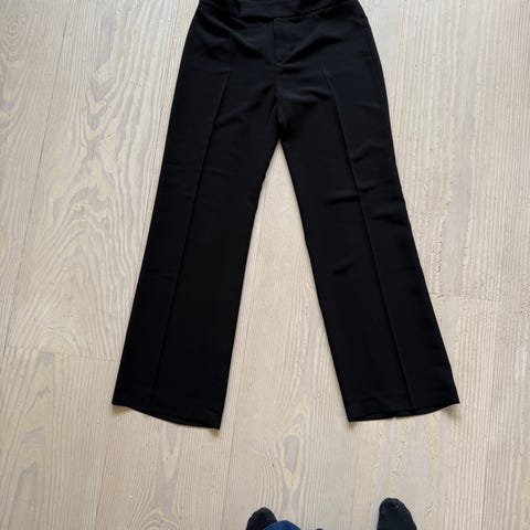 Svart bukse med vide bein. Buksa har glidelås og knapp i gylfen, beltehemper og to lommar samt innsnitt bak. Livvidde 82, beinlengde 75 (målt frå skrittet og ned), lengde målt frå midjen 103 cm. Pent brukt.