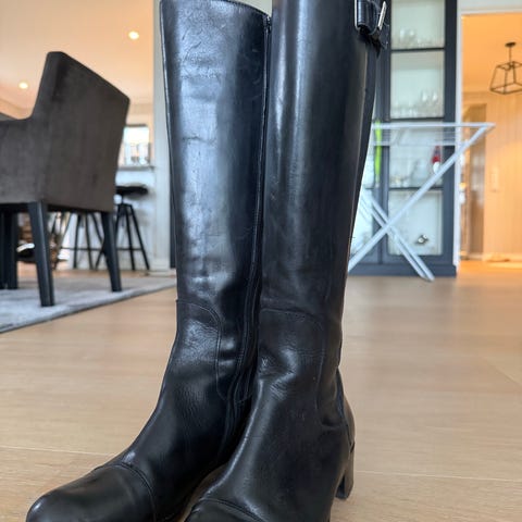 Nude of Scandinavia støvler i svart skinn, størrelse 39. Støvlene har en høyde som dekker leggen og solide såler med godt grep. God demping og romslig passform.