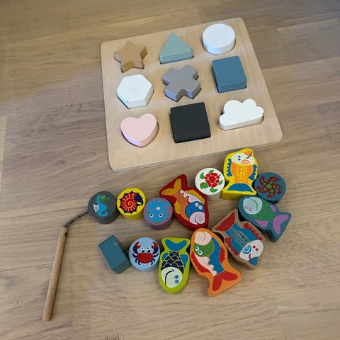 IKEA treleker som inkluderer fargerike treklosser i ulike former og størrelser, samt en svart pingvinfigur med hvite og røde detaljer. Lekene er laget av tre og er designet for barn.