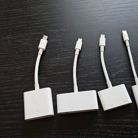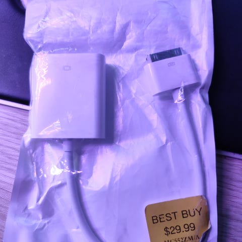 For sale: a set of three original Apple video out cables based on the iPod/iPad/iPhone's 30-pin connector. 1x VGA, 1x composite and 1x component. The component and composite cables also feauture a USB plug, I believe so you can charge your device and output video at the same time. Pent brukt, in good condition.