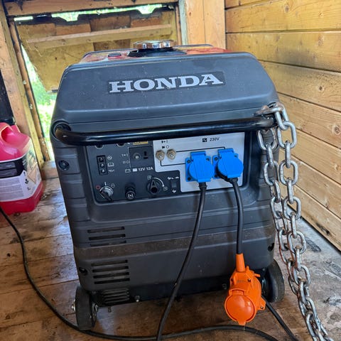 Honda EU10i bærbart strømaggregat med 230V uttak. Aggregatet har en kompakt og lett design med rød farge og innebygd håndtak for enkel transport. Passer til bruk ved camping, utendørsaktiviteter eller som reservekraft. Ny i 2019. Kun vært lagret som nødaggregat. Kun startet en gang i 2019 og en gang i 2025. Inkl. brukermanualer. Stikkord: EU10i - generator - nødstrøm - strømaggregat - inverter