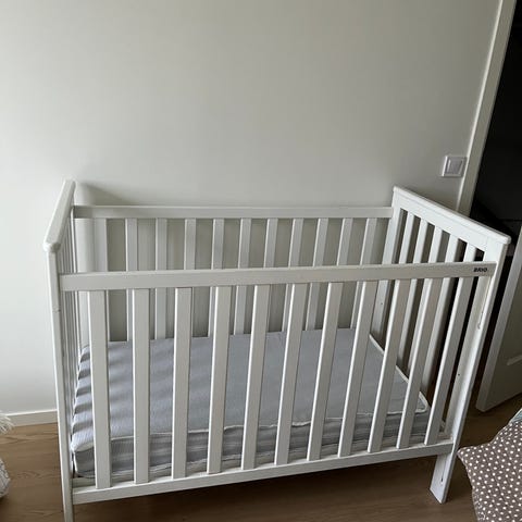 Madrass og tisselaken følger med. Den kan justeres i høyden. Må hentes på Tasta.