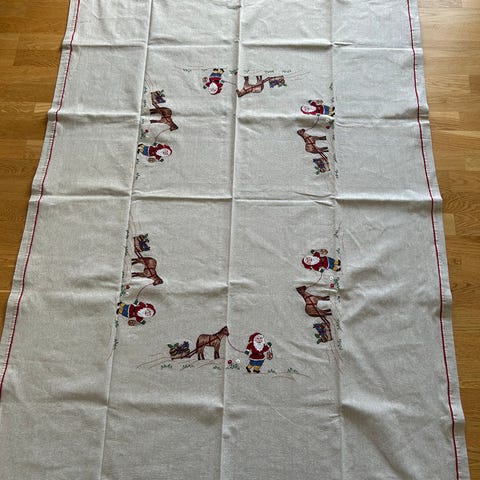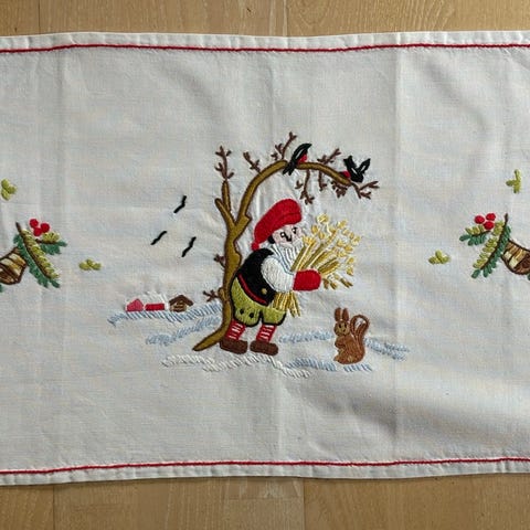 Fin og nostalgisk julebrodert duk med motiv av barn, bjeller, lys og fugler, dekorert med røde kanter. Laget i bomull og med eit veldig koseleg motiv🎄