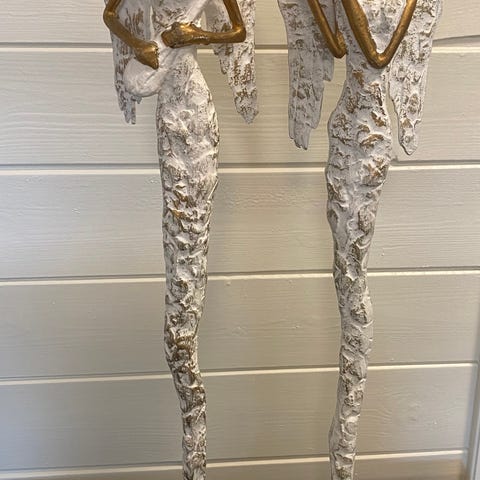 Engler i tre og metall fra Perfekt Home Collection. De er 59 cm høye, 11 cm ved vingene. Den ene har lite sår ved hals. ellers hele og fine. Orginalesken ligger de i.