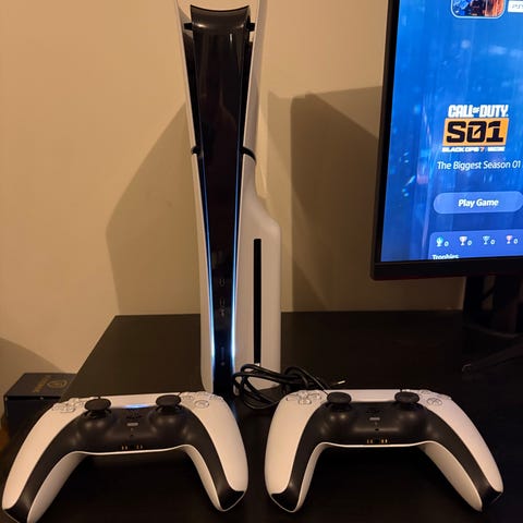 Sony PlayStation 5 spillkonsoll i hvit farge. Konsollen har et moderne design med svart frontpanel og hvite sideplater. Inkluderer tre kontrollere i svart, kamuflasjemønster og hvit farge, samt en stand for den. Egnet for hjemmeunderholdning og spillopplevelser.