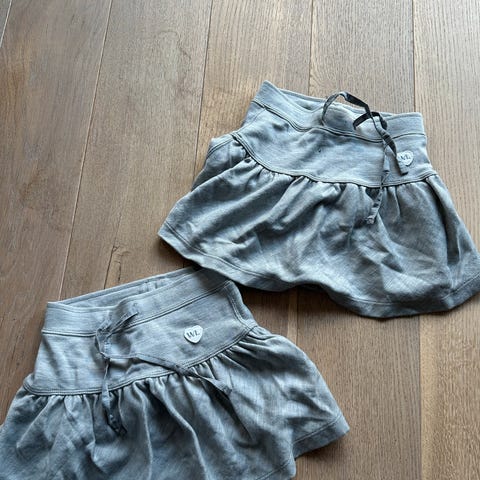 Skjørtet er 100 prosent merinoull. Cardiganen er laget av blandingsstoff med noe ull og mohair. Tjukk og god.