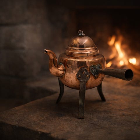 Gammel kobberkjele. 16 cm høy med lokk. 14 cm i diameter i bunnen. 24 cm fra tuten til bakpå.