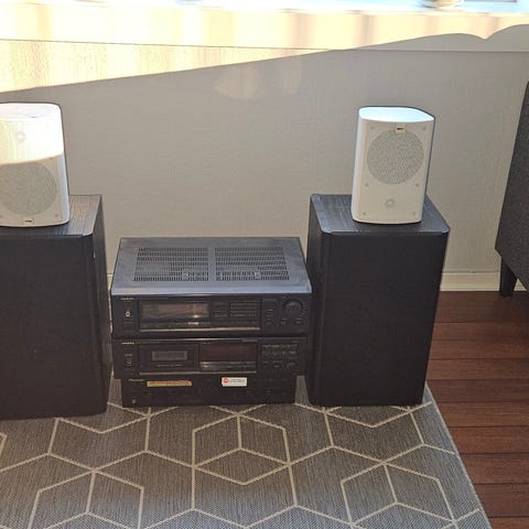 Anlegg fungerer greit , cd skifter ok , kassettspiller står en kassett i så der bare klikker det , radio og forsterker funker fint med god lyd , er med surround høytalere også