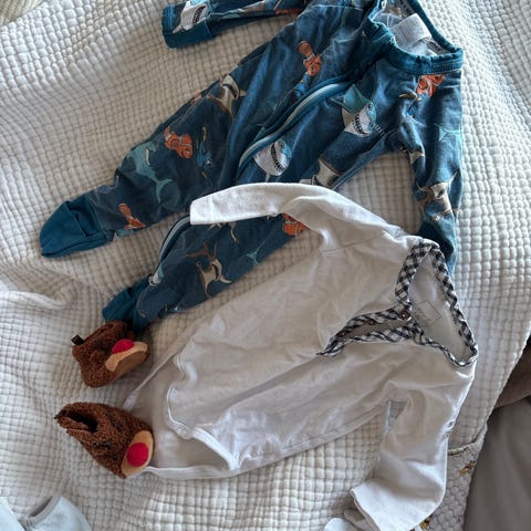 Selger en pakke med nøytrale babyklær fra merker som Lindex, newbie, reflex, H&M og KappAhl. Noen har søte bamser på seg. Noe er aldri brukt, bare vasket.