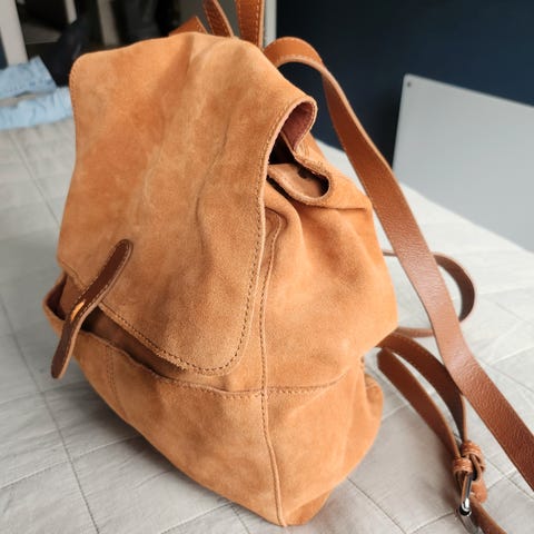 Vintage veske i vevd jute/hamp med skinnreimer. Veldig fin til både oppbevaring av f.eks garn eller doruller, eller som skulderveske. Solid og tettvevd med gode reimer i tykk skinn. Måler 65cm i hel lengde ink. reimer. I god stand, kun en flekk oppi veska. PS! Glad i vintage? Se mine andre annonser. PSPS! den hjemmestrikka sorte jakka er også til salgs.