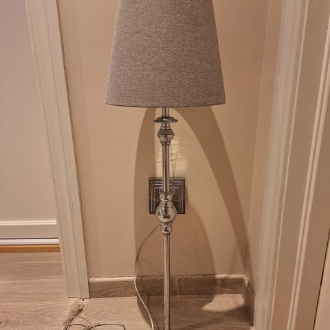 Selve lampen er i metall, virker som den skal, lampeskjermen har noe små merker etter flytting. ( denne kan skrus av og byttes).