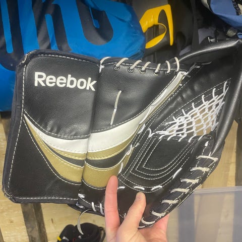 Ishockeygenser i størrelse som passer til keeper, med hvit farge og svarte skulderpartier