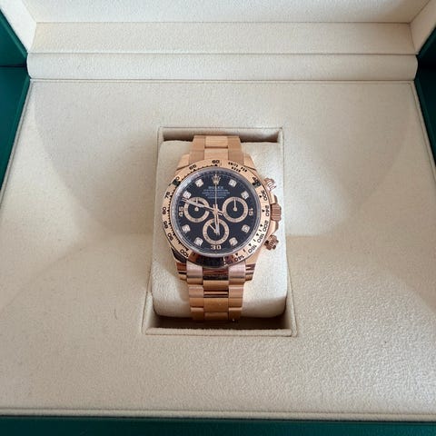 Selger en helt ubrukt (ok, da tok den på hånda for å ta bilde) Daytona for en kompis som ikke vil være på Finn. Norsk 116500. Klokka er fra 2021 og kommer med alt, kvittering, boks, sertifikat osv. Alle som er i markedet for denne klokka vet alt om denne, så mer info trengs ikke. Han trenger ikke selge klokka, men vil teste markedet litt og la den ligge ute en stund. Derfor trenger vi ikke noen desperate bytteforslag eller skambud denne gangen. :)