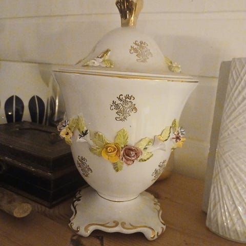 Keramisk krukke med lokk, dekorert med gullfargede detaljer og relieffmønster av blader og frukt. Krukken har en rund form med to håndtak på sidene. Lokket har en dekorativ topp. Lokk viser sprekker og er limt. Passer til dekorasjon eller oppbevaring av tørre gjenstander.