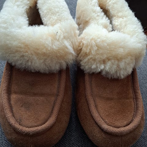 Saueskinntøfler størrelse ca. 32-33. Såle er 20 cm.