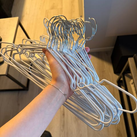 30 hvite kleshengere selges. Hengerne er ganske like, men alle er ikke kjøpt fra samme sted så de kan variere noe i tykkelse og form.