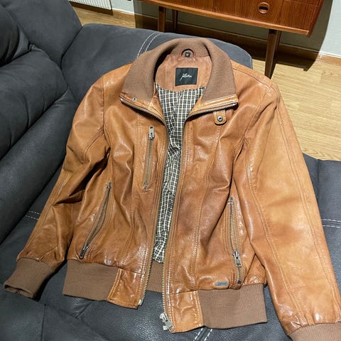 Veldig fin brun og lett skinnjakke. Str. 48. (S/M). Den har 3 lommer innvendig og 4 lommer utvendig. Den er bare brukt 4-5 ganger. Kan sende, frakt tilkommer kjøper.