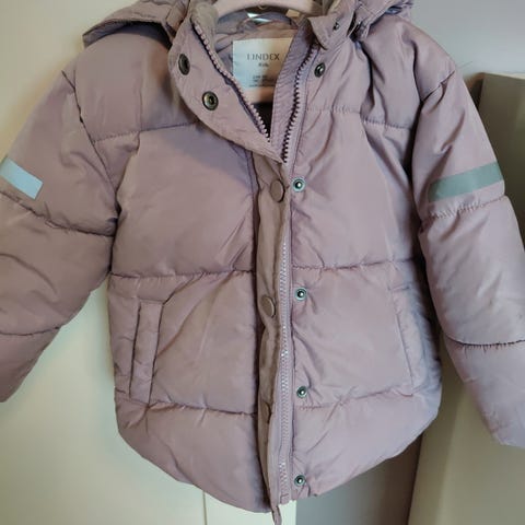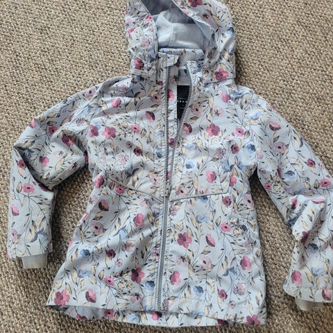 Lindex Basic Needs barnejakke i størrelse 92, designet for jenter. Jakken er hvit med et blomstermønster i lilla og grønne toner. Den har hette og glidelås foran. Materialet er tilpasset barnets komfort og beskyttelse mot værforhold.