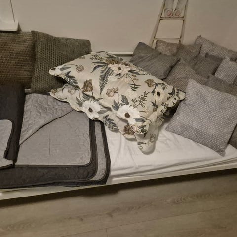 Fire flotte fargerike pynteputer selges samlet. 100% polyester. Kan vaskes på 30 grader. 4 innleggsputer og 4 putetrekk med glidelås. Størrelsen er nok offisielt 50cm*50cm, men med pute inni kan det se ut som 45cm*45cm. De er brukt til pynt oppå seng, og er kun blitt flyttet på. Ikke blitt utsatt for press eller slitasje. Har ikke strøket trekkene, så noen rynker kan forekomme.