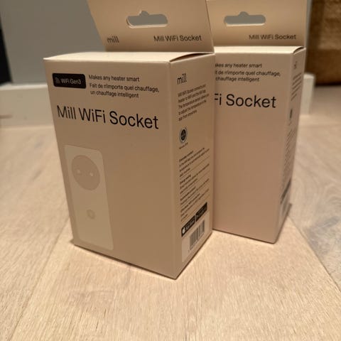 Mill Smart WiFi Strømbryter med Stikkontakt i hvit farge. Enheten kobles til WiFi for trådløs styring av tilkoblede elektriske apparater. Den har en standard norsk stikkontakt og kan kontrollere strømtilførselen via en mobilapp. Passer for bruk i hjemmet for fjernstyring og tidsinnstilling av elektriske enheter.