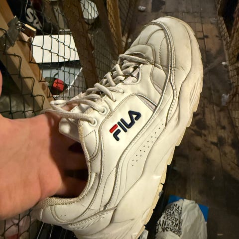Skoene har en robust konstruksjon med hvit såle og merkets logo på siden.