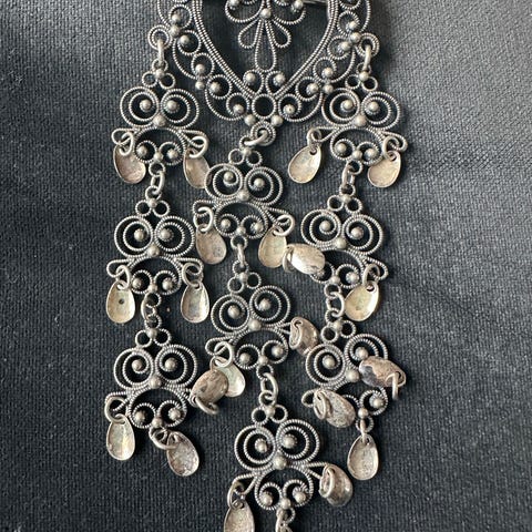 Sylvsmidja sølje i sølv. Diameter 6 cm. Rund, tradisjonell sølje med detaljert filigransarbeid og nål på baksiden for feste. Laget i sølv som hovedmateriale. Brukes primært på bunader fra Telemark.