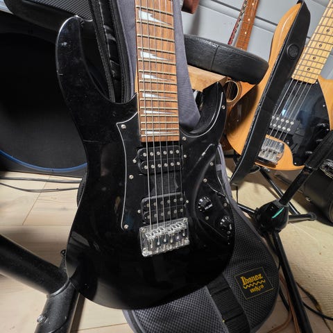 Ibanez elektrisk gitar i svart farge med trehals og hvite markeringer på gripebrettet. Inkluderer bæreveske, hodetelefoner og ekstra tilbehør. Egnet for ulike musikksjangre og brukere som ønsker en elektrisk gitar med tilhørende utstyr.