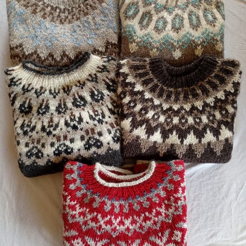 Selger unike, hjemme strikkede ull gensere – hver med tradisjonelle nordiske mønstre og solid håndverk. Strikket med Per Gynt-garn, kjent for sin varme, slitestyrke og norske kvalitet. Den sorte genseren er ikke hjemmestrikket men kjøpt I forbindelse med OL. Selger disse for min nabo ❤️ str sees på lappene hun har lagt på.
