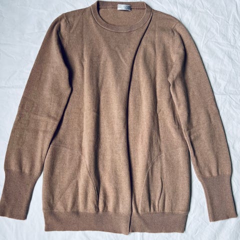 Kasjmir-genser fra det svært eksklusive italienske merket Brunello Cucinelli i str M selges. Den har nok alltid vært litt for liten og den er derfor svært lite brukt. Det har en liten åpning i sømmen på det ene ermet (se bilde), noe som vil kunne fikses med et sting. Offwhite farge. Kjøpt i USA for noen år siden og jeg mener nypris var ca 12 000kr