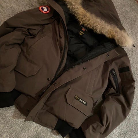 Canada Goose Vinterjakke i størrelse S, fargen svart. Jakken er designet for menn og egnet for utendørs bruk i kalde vinterforhold. Den har en hette med pelskant og er laget for å gi god isolasjon og beskyttelse mot kulde.
