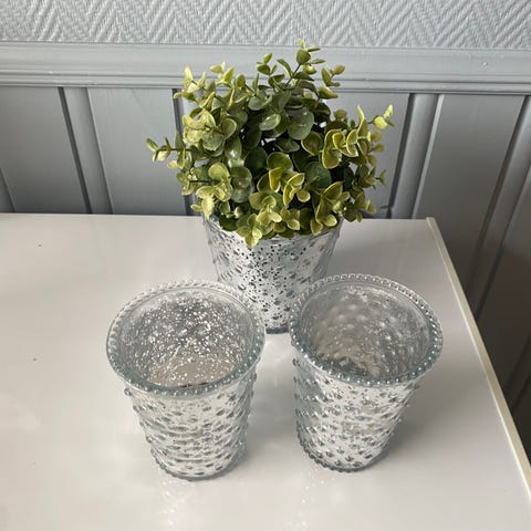 Diverse fra Perfect Home. 2 telysestaker,ca 25 cm høy. 2 vaser. 2 små og 1 stor skål. 1 etasjefat,er noen flekker på det som jeg ikke får bort. Se siste bildet.
