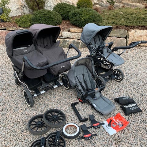 – Kan bli brukt som tvilling barnevogn eller dobbel barnevogn med to seter, to vognposer eller en sete og en vognpose.