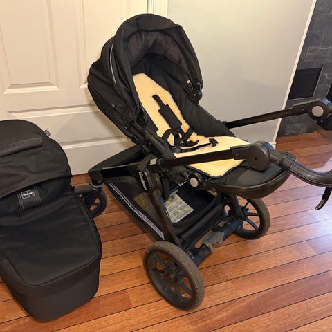 Tekstilfarge er den samme på vogn og tilbehør. Lounge grey.