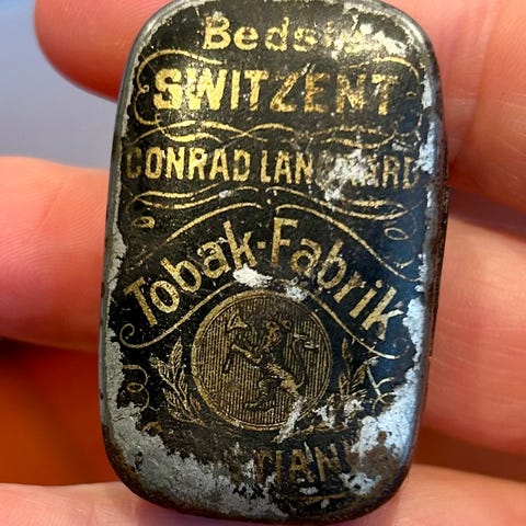 Tobakk i oval eske som er blå, rød og hvit. Norsk avlet tobakk, dvs dyrket i Norge som var vanlig under andre verdenskrig.