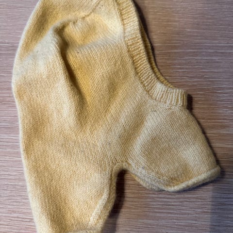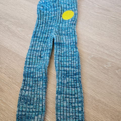 Hjemmestrikket ribbebukse, veldig god å ha under dress osv. buksa er brukt, men ikke slitt og mye bruk igjen. Se mål på buksa på bilde, innerben ser ut til å være ca 30 cm som tilsvarer ca str 80