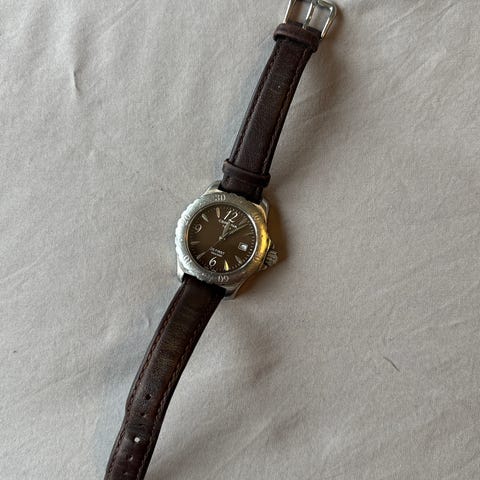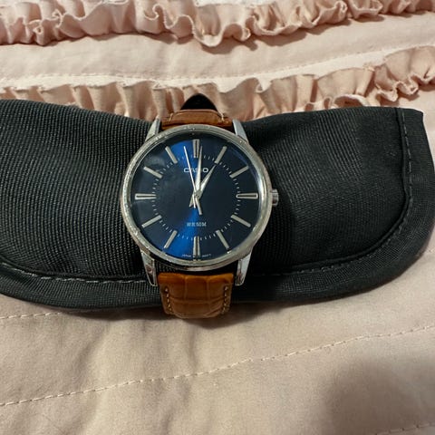 Casio Oceanus armbåndsur med svart urskive og roterende bezel. Klokken har en svart lærrem med foldespenne fra en annen eldre klokke jeg hadde fra Tissot. Klokken har datoindikator som jeg ikke har fått til å fungere. Jeg fikk denne klokken av min far for mange pr siden, men har ikke brukt den siste par årene dessverre. Batteriet er derfor tomt for strøm nå, men det kan en hvilken som helst urmaker bytte for en billig penge. Forran er den også ganske ripete, men dette kan man også få pusset opp enkelt.