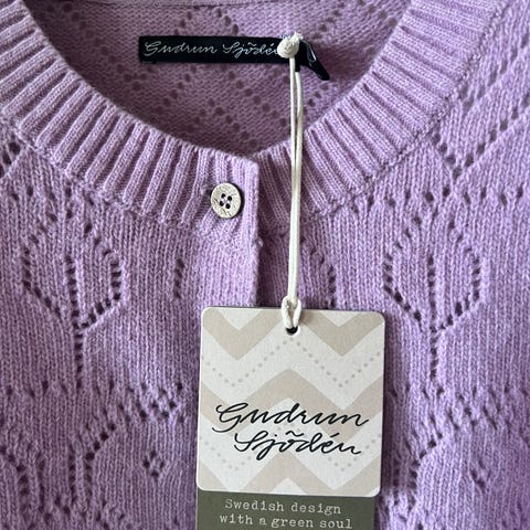 Meget pen og forseggjort cardigan fra Alpaca Society i en støvrosa farge. Skjult knapping med en større pynteknapp øverst. Har blitt liggende ubrukt i skuffen og er dessverre for liten for meg nå.