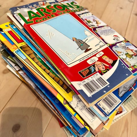 Selger en fin bunke med Larsons gale verden-tegneserier fra midten av 2000-tallet. Dette er original norsk utgave med Gary Larsons klassiske striper, supplert med blant annet Kollektivet, Dilbert, Arne And m.m. Perfekt for deg som vil fylle hull i samlingen eller bare vil ha en god dose nostalgisk humor.