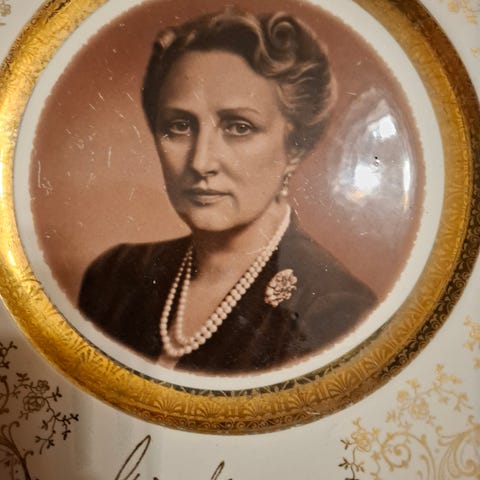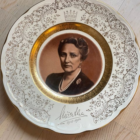 Pen vintage minnetallerken med et portrett av Kronprinsesse Märtha av Norge. Fra Norsk Flint Egersund. Tallerkenen er et samleobjekt, ofte referert til som en "kongeplate" eller "minneplatte".