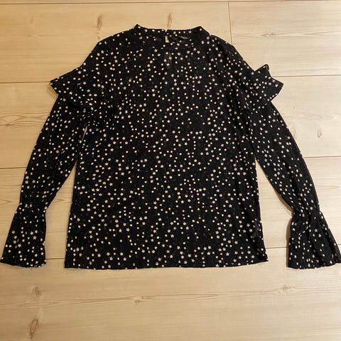 Bluse med trekvart lange ermer. Flammemønster som kan ligne grener og kvister på trær. Farger: hvit og grå. Størrelse 42-44, men den er mindre. Passer til M. Bolen har dobbelt lag med tynt og lett tøy som faller fint på kroppen.