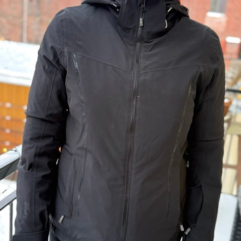 Jakken er tykkere enn skalljakker og har snøskjørt.