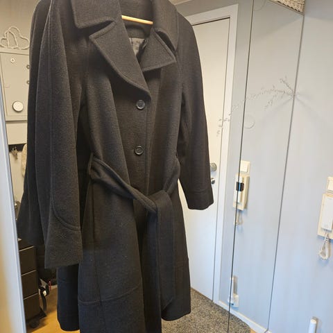 Pen innsvinget kåpe / jakke fra Pietro Filipi, sort i størrelse 38 selges pent brukt. Jakka er i ull, har dobbelspent knappelukking, lommer på sidene og detaljer ved ermene. Den er hel og fin men dessverre blitt for liten for meg.